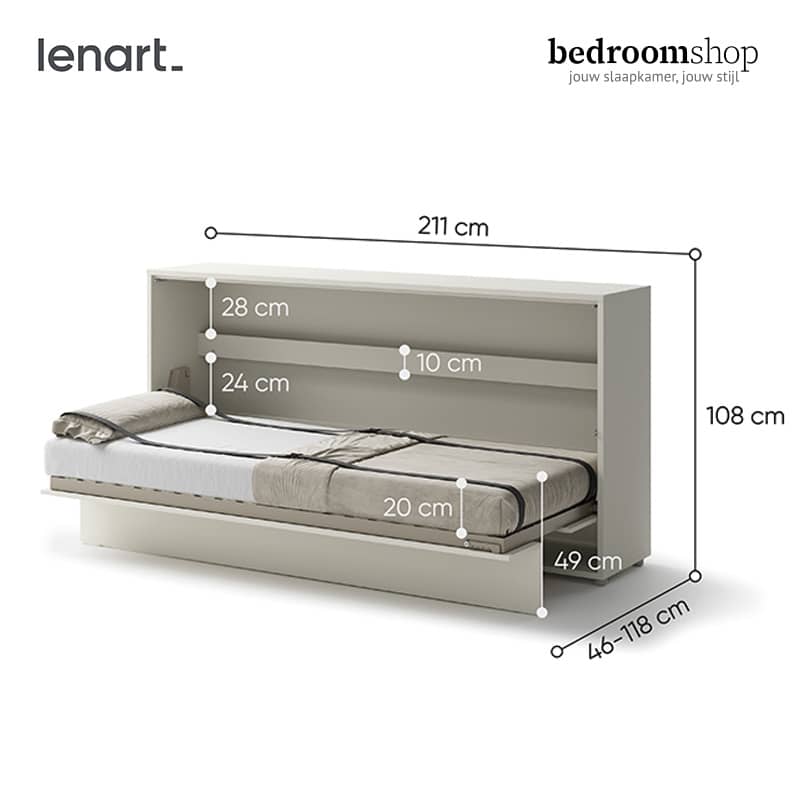 Nieuw binnen onze collectie zijn de horizontale 1-persoons opklapbedden Horizon. Prachtige en kwalitatieve opklapbedden die horizontaal omhoog gaan. Leverbaar met een slaapoppervlak van 90x200. Bekijk hier alle afmetingen van het bed.