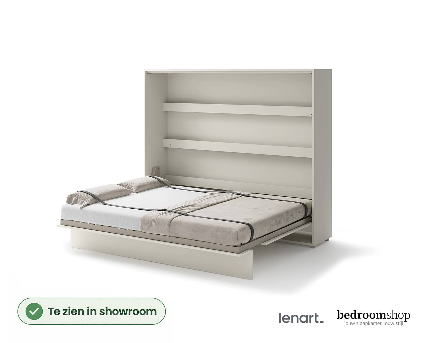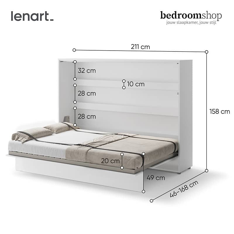 Bestel jij vandaag nog jouw gepersonaliseerde tweepersoons opklapbed via onze webshop, dan wordt jouw bestelling gratis thuisbezorgd in Nederland (excl. Waddeneilanden). Montage is mogelijk binnen Nederland en wordt uitgevoerd op afspraak nadat de onderdelen bij je zijn geleverd. Kies je ervoor om het bed zelf te monteren, zorg er dan altijd voor dat de kast stevig aan de muur wordt bevestigd voor optimale veiligheid. Met dit horizontale opklapbed haal je een praktische, stijlvolle en duurzame oplossing in huis die perfect aansluit op jouw woonruimte.