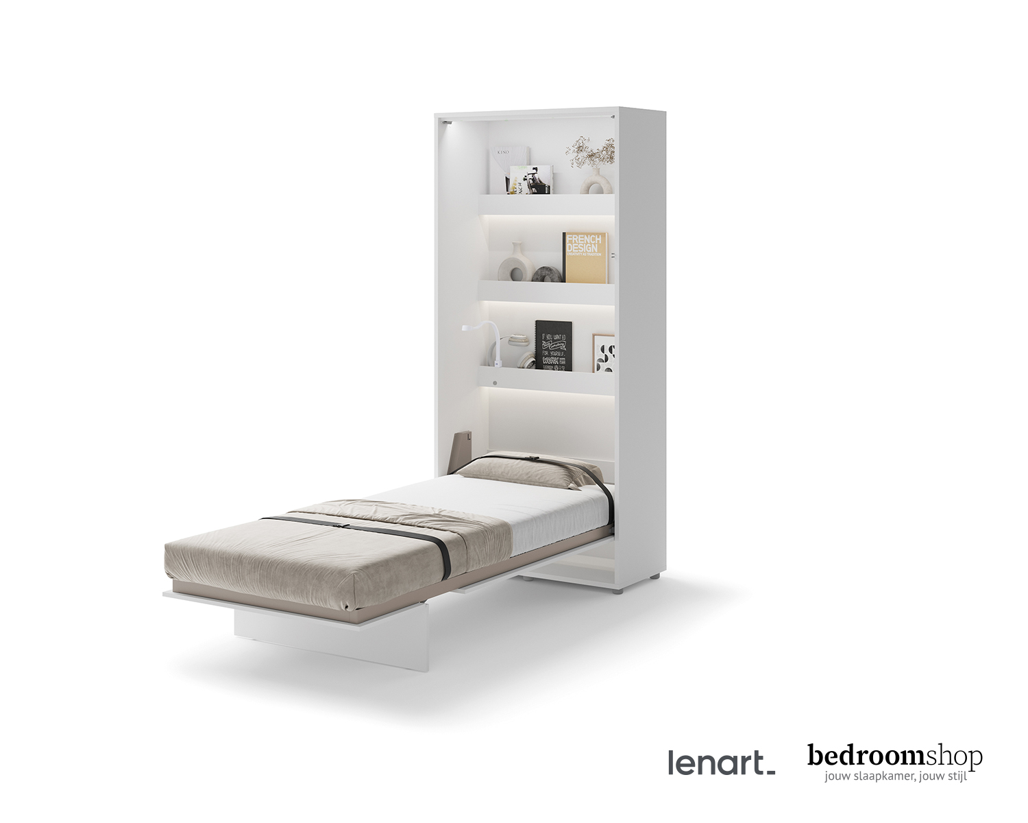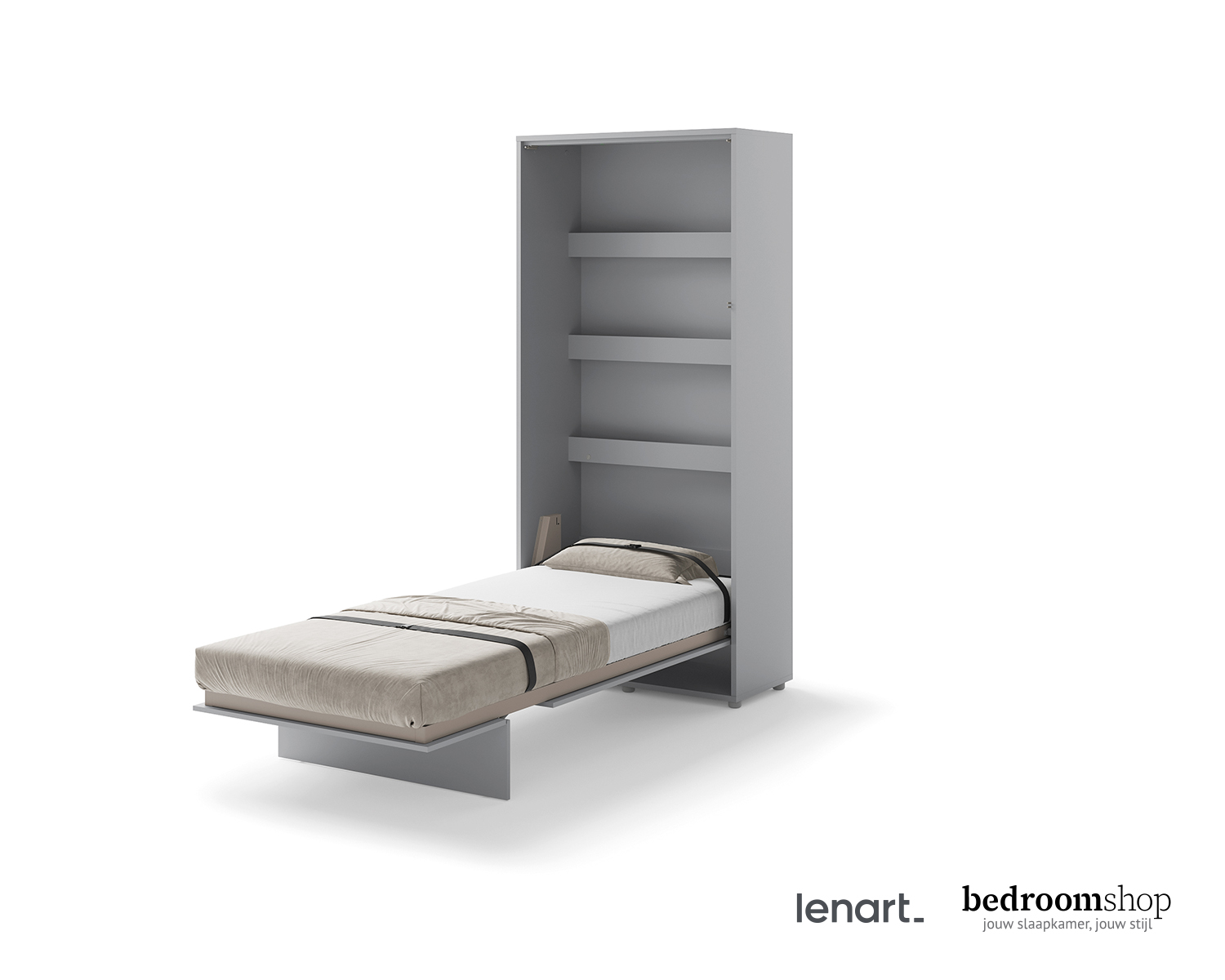 Ga je binnenkort op kamers en wil je het maximale uit je kamer halen? Kies dan voor ons praktische opklapbed Student. Volledig naar wens samen te stellen. Je kunt kiezen uit alleen een opklapbed 90x200 of 120x200, met boekenkast, met 1-deurs of 2-deurs kast. Alles is modulair, dus ook eigen inrichtingen mogelijk. Ook zeer geschikt voor volwassen of senioren die op zoek zijn naar een praktisch 1-persoonsbed met een mooie inrichting.