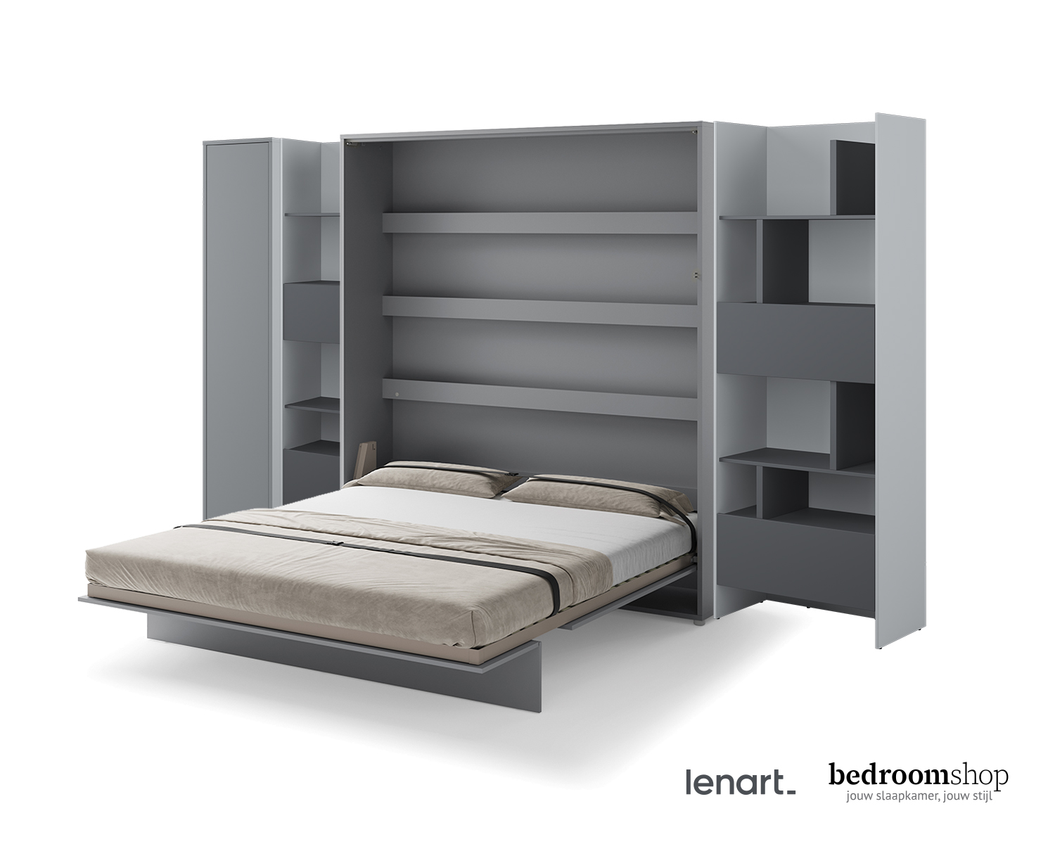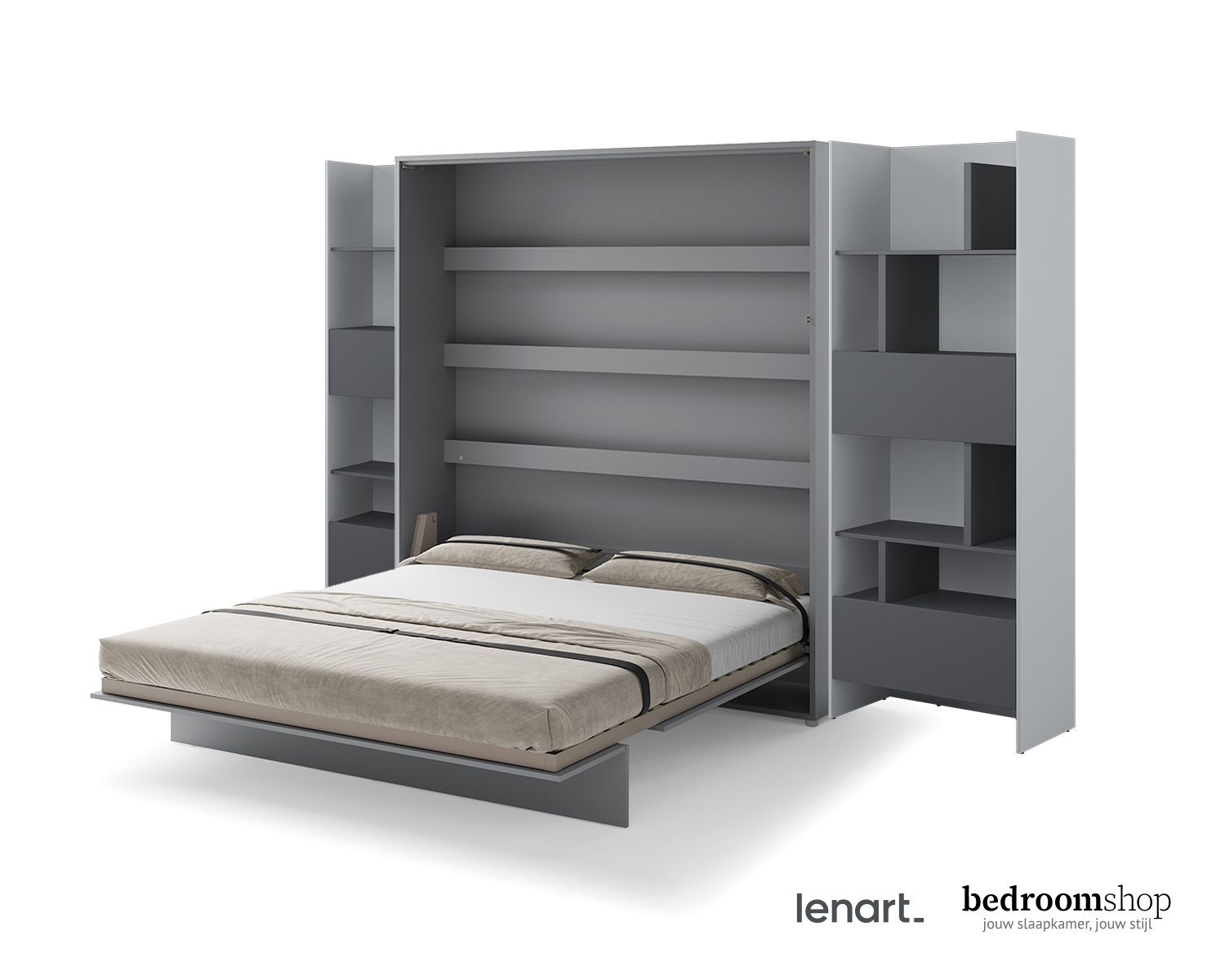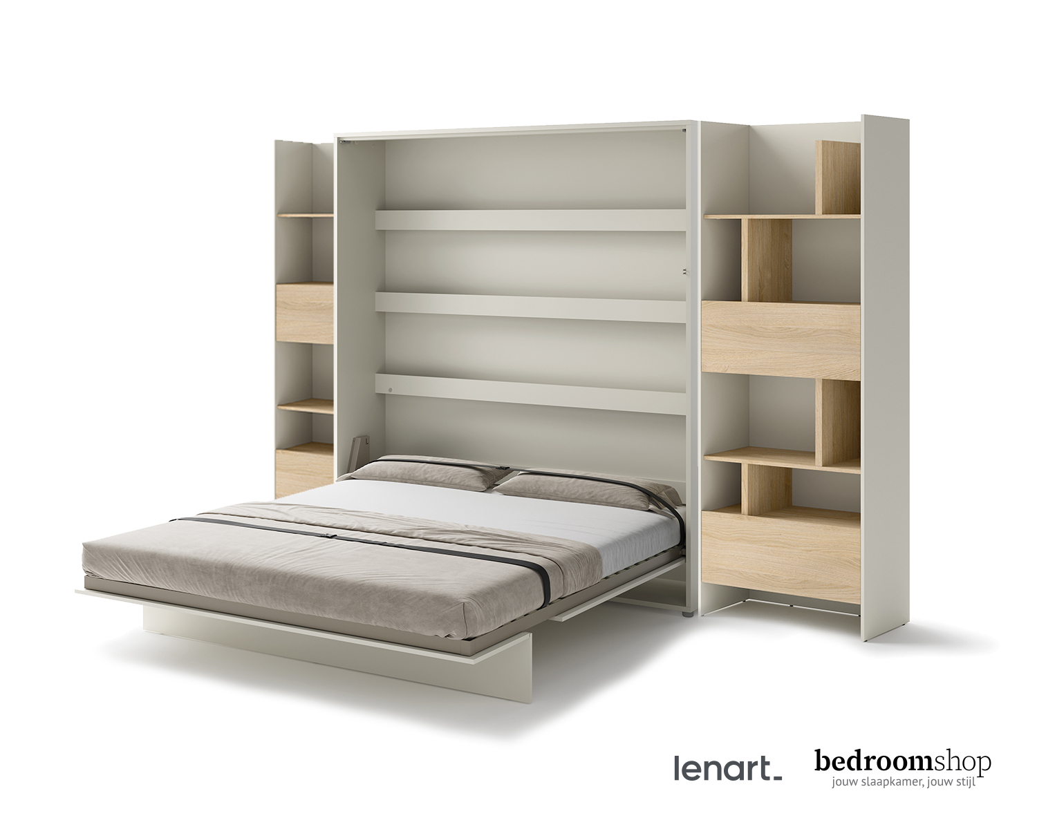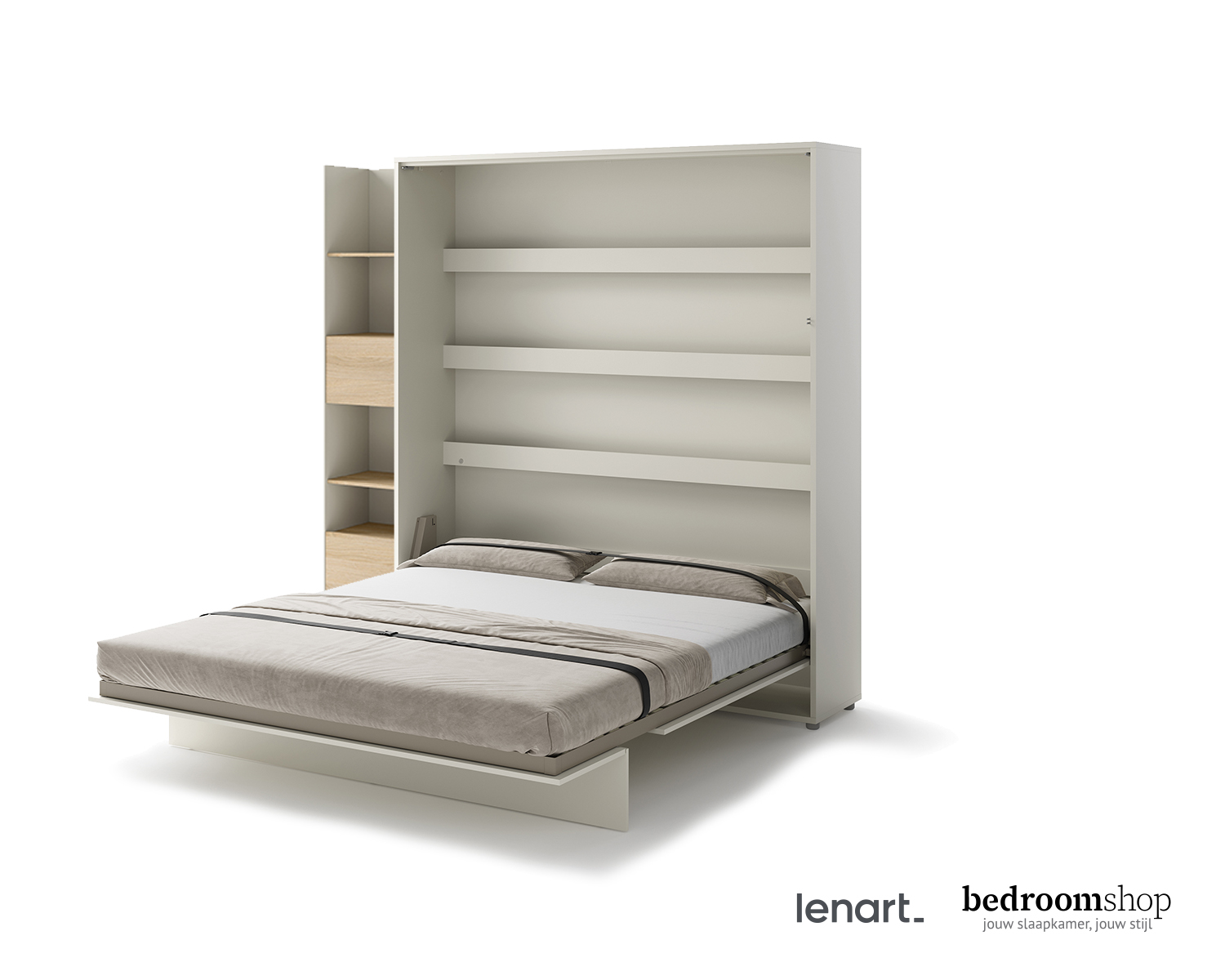 Opklapbed Studio is een prachtige totaaloplossing voor jouw appartement of studio. Creeer in een handomdraai een comfortabele slaapomgeving en overdag weer ruimte voor visite, feestjes en leefruimte. Opklapbed Studio is verkrijgbaar in 4 verschillende kleuropstellingen en inrichtingen. Van een standaard opklapbed tot een prachtige Excellence inrichting met een smalle en brede boekenkast en een 1-deurskast met legplanken.