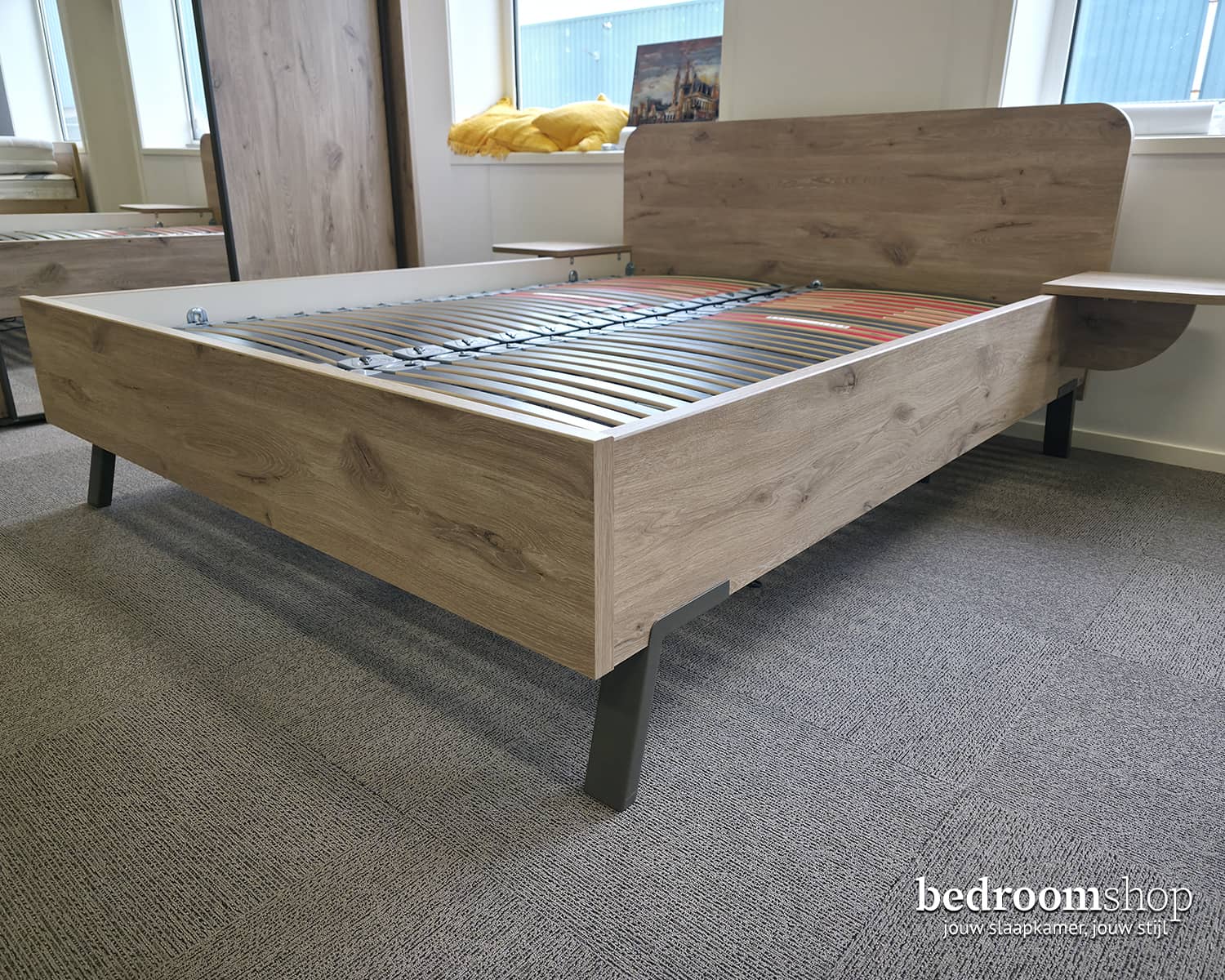 Het bed is strak afgewerkt en bevat standaard geen verlichting achter het hoofdbord.