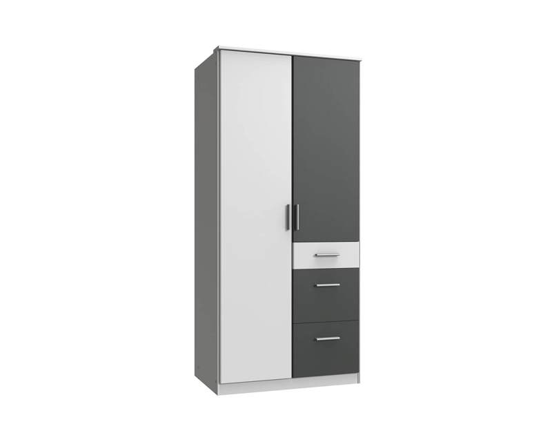 Deze stoeren babykamer Dream is compleet met een draaideurkast in wit/grafiet, beschikbaar in twee praktische formaten: