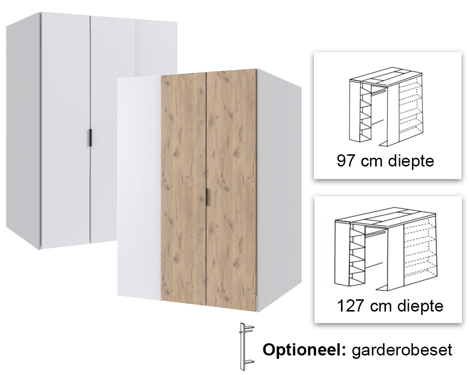 De inloopkast is leverbaar in twee kleurvariaties, waaronder geheel wit of wit met houtlook accenten.