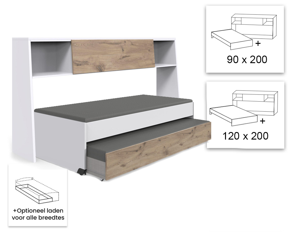 Leuk bed leverbaar in twee kleurvarianten en voorzien van een praktische bovenbouw.